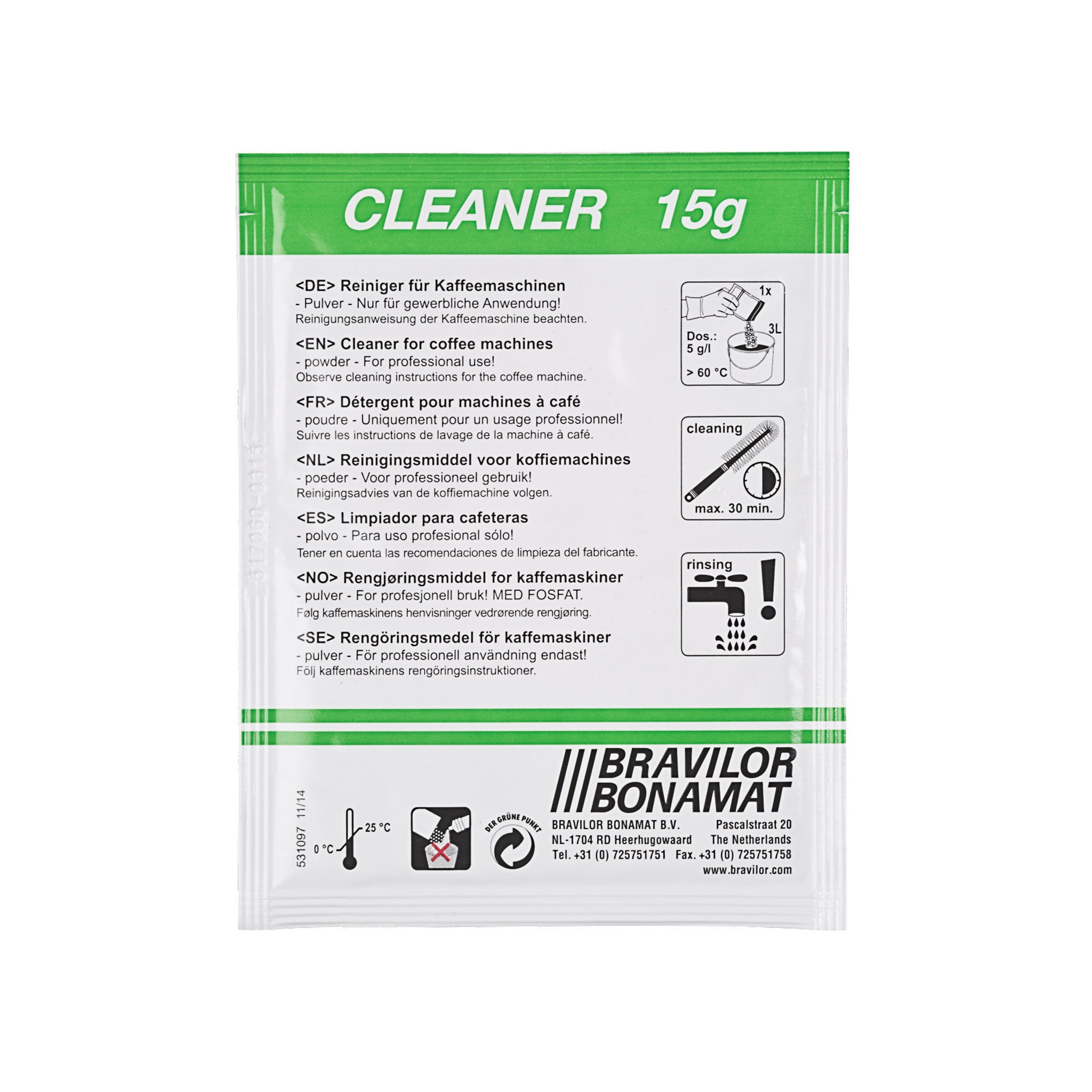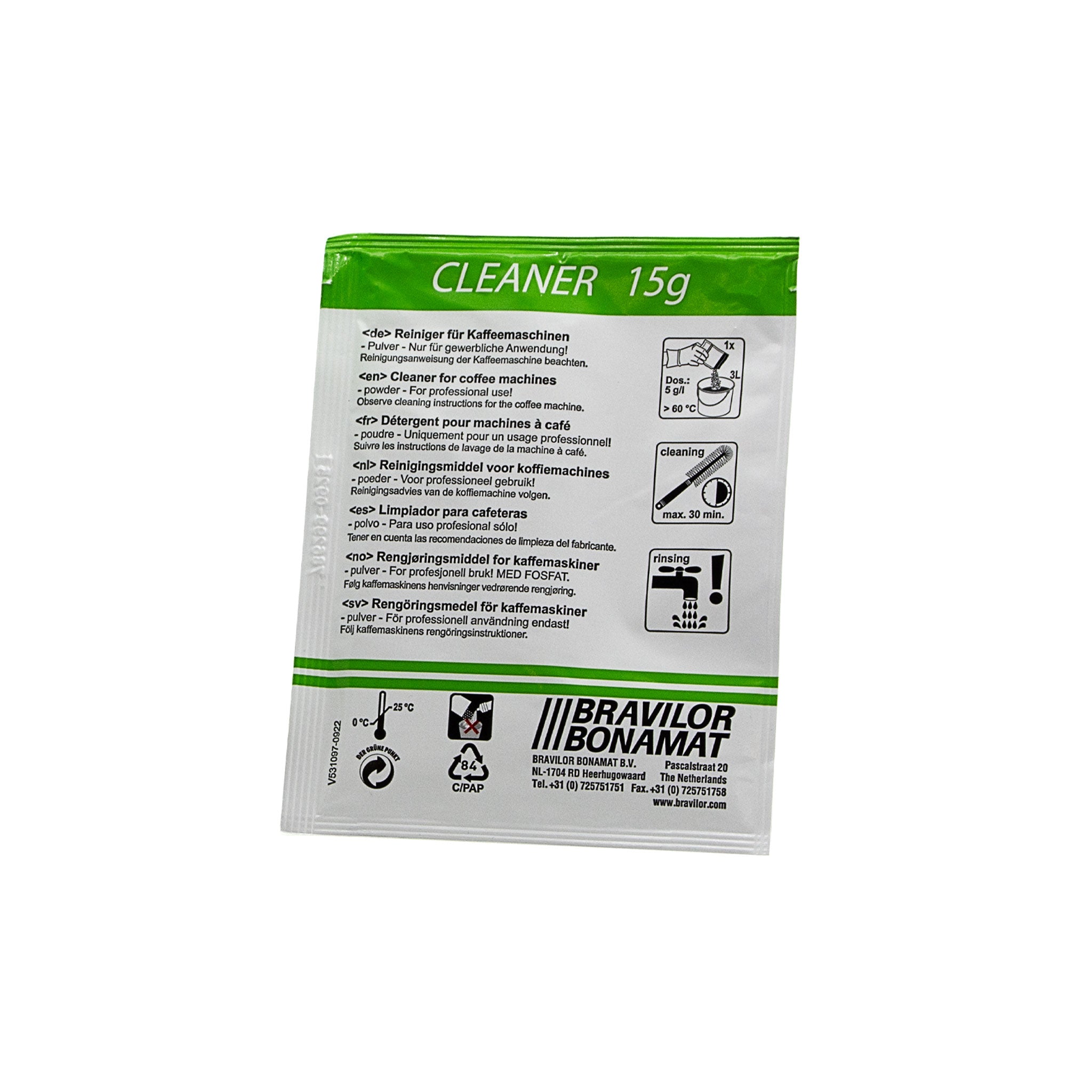 Cleaner är ett effektivt och professionellt rengöringsmedel från Bravilor Bonamat, utvecklat för att avlägsna kaffe- och tebeläggningar i kaffemaskiner och bryggare samt termosar. Regelbunden rengöring säkerställer optimal smak, bättre hygien och längre livslängd på din utrustning.